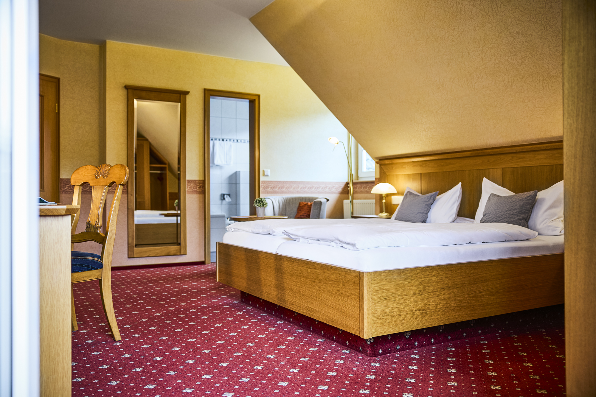 - Die Zimmer auf der 2. Etage sind mit Teppichboden ausgestattet